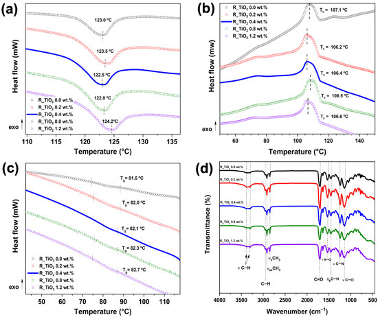 Thermal and chemical characterization corresponding to 3D-printed polymer nanocomposites: (a) glass transition temperature (Tg), (b) crystallization temperature (Tc), (c) melting temperature (Tm), and (d) ATR-FTIR.
