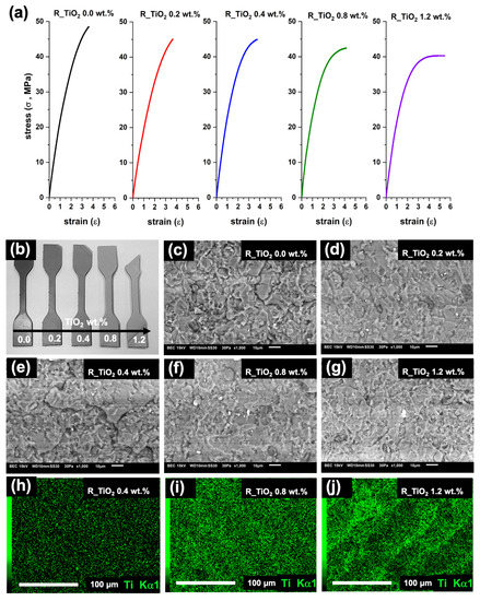 (a) Stress–strain behaviors of 3D-printed polymer nanocomposites based on resin/TiO2 NPs (R_TiO2 X wt.%, where X = 0.0, 0.2, 0.4, 0.8, or 1.2); (b) 3D-printed tensile bars of each nanocomposite system (dog–bone type); (c–g) fracture images by SEM on the transversal section; (h–j) elemental mapping by EDS corresponding to some representative 3D-printed polymer nanocomposites (R_TiO2 X wt.%).