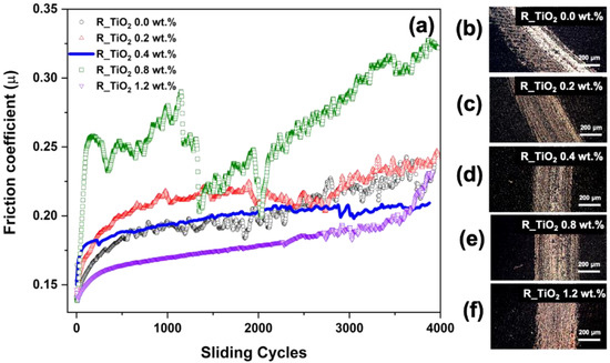 3D printed polymer nanocomposites (R_TiO2 X wt.%) and control sample (pure resin) (a) friction coefficient (µ) evolution, and (b–f) images of the wear tracks.