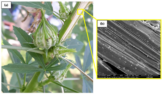 Kenaf fiber (Hibiscus cannabinus L.) is one of the most commonly used NLFs as reinforcement in polymer matrix composites and in several other industrial applications [36]. In 2020, the total harvest of kenaf crops globally yielded 126,000 tons [37]. These fibers have a significant advantage in terms of growth rate; about 3 meters in 3 months and at roughly 5 cm of thickness, even in adverse weather conditions [38]. The kenaf plant, illustrated in Figure 1a, provides distinct fibers extracted from different parts (leaves, stalks, seeds) [39], as long as sufficient care is taken during planting, growing, and harvesting [40,41]. Figure 1b illustrates the kenaf fiber surface under high magnification.