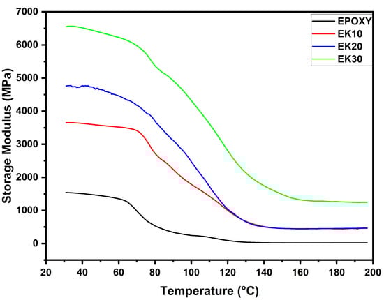 The storage modulus represents the elastic behavior of a material when subjected to sinusoidal stress. The storage modulus provides information about the dynamic-mechanical properties of a material, such as stiffness, load capacity, crosslink density, and interfacial strength between fiber and matrix [69,75,76,77]. A clear understanding of the storage module provides important information about the stiffness, degree of crosslinking, and fiber/matrix interfacial bonding.