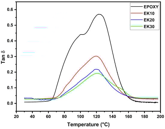 The Tan curve, also called loss ratio or damping factor, is obtained from the ratio between the loss modulus and storage modulus (E″/E′) and is associated with the heat dissipation during each deformation cycle and an elastic behavior of the material. Thus, from Figure 5, the consequence of kenaf addition and the temperature variation on the composites damping properties can be noted. The Tan values of epoxy–kenaf (EK) composites (0.19–0.30) in Figure 5 are, in every case, lower than EPOXY (0.57). These results indicate that the neat epoxy presents a higher damping factor, which is related to a greater inelastic deformation with a higher energy dissipation. On the other hand, the decrease of the peak of the EK groups can be attributed to the interlocking mechanism between the fibers and the polymer matrix, which restricts the chain movement [80]. This is visualized where the EK30 presented the lowest Tan peak height (0.19) in Figure 5 among the three other groups, indicating strong interfacial interaction and lower energy dissipation at the interface [81,82].