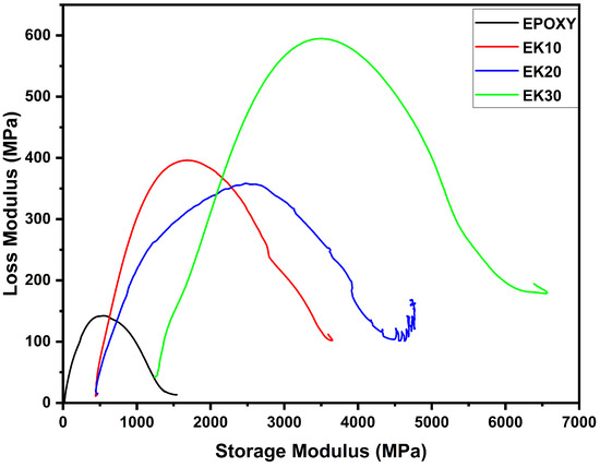 All composites reached a maximum peak height in the glass transition region; the values are presented in Table 2. As shown in Figure 4, the glass transition region starts at 70 °C. In this region, the loss modulus is low and constant. However, in the rubbery state the viscous behavior of the material increases. This occurs via superposition of the molecular segment motion in the polymeric chain with mechanical deformation, resulting in high internal friction and inelastic deformation [79]. This results in a high dissipation energy, with the loss modulus reaching the highest point of the peak, related to Tg of the material. After reaching this point, the polymeric molecules pass to a relaxed state and reduce their internal friction. This reduction in friction causes a drop in the loss modulus. Neat epoxy has the lowest E″ value (0.14 GPa), but with the addition of kenaf fibers an increase is observed in the loss modulus of the composites of about 178.5% for EK10, 150% for EK20, and 321.4% for EK30. The increase in kenaf fiber content as reinforcement induced greater internal friction, resulting in a higher E′’ value.