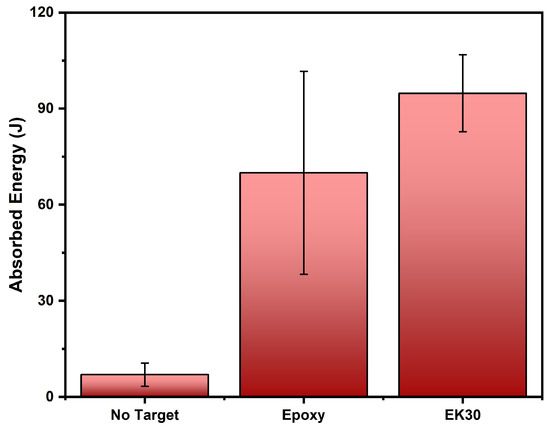 To compare the ballistic absorbed energies, Figure 8 shows the values of from Table 3 including the corresponding error bars. Despite the greater mean value of absorber energy, for the composite, the relatively higher values of the standard deviations render them similar. The VL of EK30 in Table 3 is superior to that reported for epoxy composites reinforced with the same 30 vol% amount of caranan and tucum fibers [87,88] as well as sedge fiber [89]. An ongoing investigation with an increased number of shootings is expected to statistically confirm the superior ballistic performance of kenaf-fiber-reinforced epoxy composites.