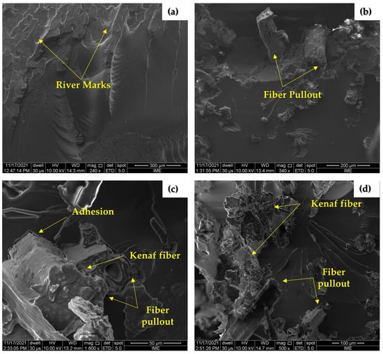 In Figure 9, one can observe in the fractography of the neat epoxy (Figure 9a) the high density of river marks, which indicates a brittle fracture due to the absence of reinforcement. In the micrograph of EK10 (Figure 9b), one can observed a few pulled-out fibers, which can be attributed to the low interfacial adhesion between the fiber and the polymeric matrix due to the presence of voids and cracks. As for the EK20 and EK30 composites (Figure 9c,d), they have an even greater pullout density due to an increase in the adhesion of the reinforcement to the matrix. This can be related to relevant mechanical properties with respect to the other groups. Indeed, recent ballistic results for epoxy composites reinforced with caranan fiber [87] displayed cracks and delamination. This indicates an adhesion to the matrix less efficient than that of kenaf fiber revealed in Figure 7 and Figure 9.