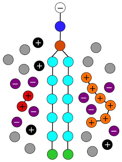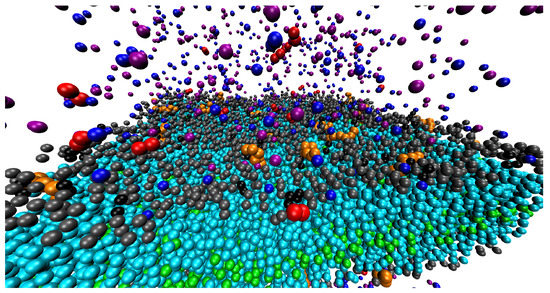 The membrane-forming phospholipids are modeled as the amphiphilic double-tail surfactants containing two chains formed by six strongly hydrophobic beads connected via one medium hydrophobic bead to a hydrophilic bead (see Figure 1). The interactions of phospholipids with other components are described by the commonly used parameters (see the next part). Their number (1708 phospholipids in a simulation box of the size ) is a result of a systematic preliminary study aimed at the reproducible formation of a regular continuous high-density membrane of appropriate lateral tension [59] preventing excessive bending (either spontaneous or interaction-induced bending). A great majority (90%) of phospholipids contain one neutral water-soluble (hydrophilic) terminal bead and 10% of species pose one negative elementary charge emulating the anionic group. For simplicity, none phospholipid bears any modifying group. The bonds are modeled by harmonic springs according to Equation (2) (), the equilibrium distance . and the angular cosine potential were applied to achieve the desired chain rigidity ().