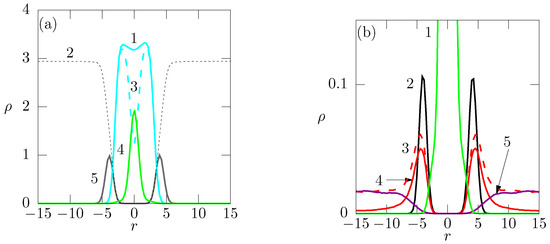 (a) Density profiles of phospholipid bilayer (system No. 1, see Table 2): 1 (cyan solid)—profiles of hydrophobic lipid tail, 2 (gray dashed)—solvent profile, 3 (cyan dashed)—hydrophobic beads (except the end beads), 4 (green solid)—noncharged end-bead profile, 5 (gray solid)—noncharged lipid heads profile; (b) Density profiles of charged end-groups and monovalent ions in the same systems No. 1 and 2 (Table 2): 1 (green solid)—noncharged end-bead profile, 2 (black solid)—negatively charged lipid head profile, 3 (red solid)—monovalent cations Na (20%), 4 (red dashed)—monovalent cations (10%), 5 (purple solid)—monovalent anions Cl (20%).