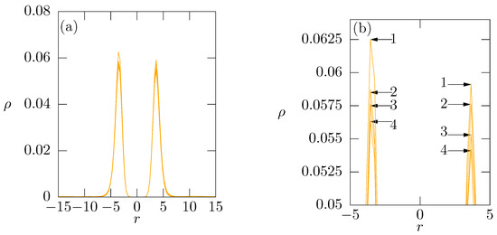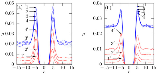(a) Density profiles of 32 oligomer -peptides added to the membrane; (b) Zoom of peaks of density profiles of oligomer -peptides of amount of 32. Curve (1), (2), (3), (4) corresponds to 25, 50, 100, 150 Me beads respectively.