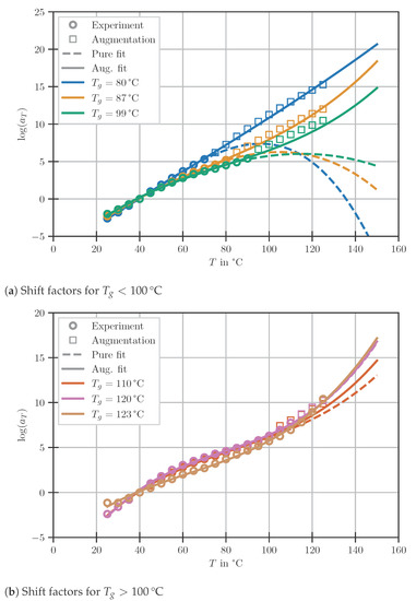 To generalise and gain the ability of predicting shift factors for arbitrary temperatures, the cubic model defined in (3) is used. As shown in Figure 4, the model fit by a standard least square approach is in excellent agreement with the existing data. However, from Figure 4a, it becomes clear that the model is not suitable for extrapolation since no experimental data are available for low at high experimental temperature since experimental temperatures must be limited to avoid post-cure [35]. Rather than capturing the trend of a steep monotonic increase of with temperature, a flattening or even decline of the curve is predicted.