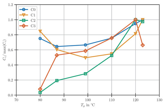 The stress relaxation is shifted towards longer times at increasing . Furthermore, the shear relaxation modulus in the glassy regime decreases with increasing DOC. Within the regarded range of between 80 and 123 °C, the stiffness is reduced by almost 40%. This significant decrease is in line with previously published findings on cure-dependent properties of EP. According to the structure–property-relationships discussed in [32,33,34], the reduction of with cure is caused by the reduced chain mobility of the crosslinked molecular structure. This leads to a reduced packing density and a higher amount of free volume during cool-down into the glassy state. However, authors that focus on material modelling rarely reported a negative correlation between DOC and . It was either not clearly found during the measurements [17,18,22,23], discarded [20] or attributed to measurement uncertainties [25]. In this context, the device compliance which limits the measurable stiffness of parallel-plate geometries [12,21] may play an important role. Due to the pronounced cure-dependence of , it must be concluded that the often-adopted approach of time–cure analogy [17,18,22,23] is not applicable to the selected resin system.