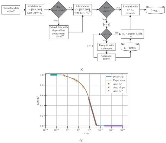 Fitting of the master curves at partial cure. (a) Workflow to augment partial datasets and determine Prony-parameters. (b) Added Data for Prony-series fitting, experimental data at .