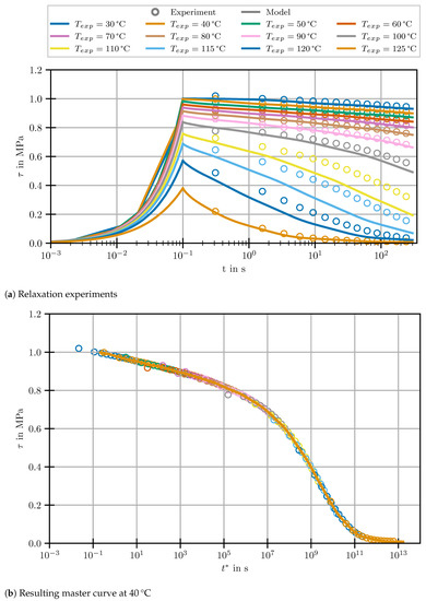 As can be seen, the model captures the master curve, which was used to fit the model parameters excellently throughout the entire time range. In case of the relaxation experiments, very good agreement for low to medium temperatures can be observed. From = 100 to 120 °C, however, model and experiment deviate slightly. At the highest temperature of 125 °C, the agreement between model and experiment is excellent again. Given that the deviations only occur in the relaxation experiment, but do not persist in the master curve, they can be attributed to imperfections in the fit of the shift factors .