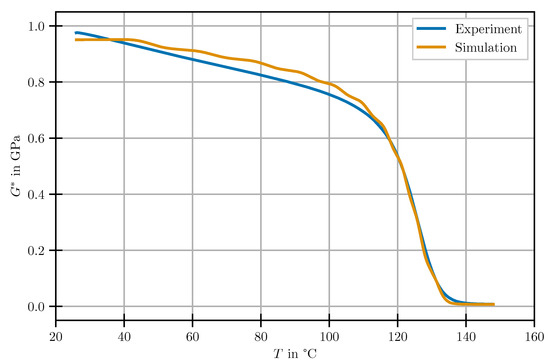 In order to investigate the predictive capabilities of the developed model, the insights obtained by relaxation experiments are applied to the numerical reproduction of the DMA experiment described in Section 2.2.3. It is analysed using the UMAT implementation in Abaqus/Standard. The simulation is set up with an ideal state of pure sinusoidal shear deformation with an amplitude of % and frequency of 1 Hz as BC. The specimen’s temperature is defined to rise from 25 to 150 °C with a heating rate of 2 . The predicted complex moduli are shown together with their experimental equivalents in Figure 8.