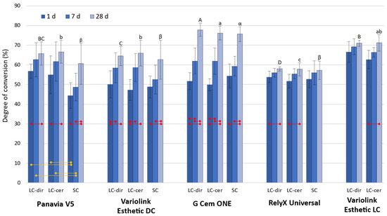 Degree of conversion (mean values ± 1 standard deviation) measured after 1 day, 7 days, and 28 days for the following curing protocols: LC-dir—light-cured directly, LC-cer—light-cured through a ceramic layer, SC—self-cured. Yellow lines at the bottom of the plot denote statistically significant differences among curing protocols. Red lines in the middle of the plot denote statistically significant differences among time points. Same letters above the bars indicate statistically similar values for inter-material comparisons of the degree of conversion values reached 28 days post-cure. These DC values were compared for each of three curing protocols separately, the comparisons within individual curing protocols (LC-dir, LC-cer, and SC) are represented by uppercase, lowercase, and Greek letters, respectively.