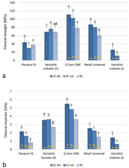 Flexural strength (a) and modulus (b) represented as mean values ± 1 standard deviation, measured after 28 days in distilled water followed by artificial aging via 7-day immersion in absolute ethanol for the following curing protocols: LC-dir—light-cured directly, LC-cer—light-cured through a ceramic layer, SC—self-cured. Yellow lines at the bottom of the plot denote statistically significant differences among curing protocols. The results of inter-material comparisons within individual curing protocols (LC-dir, LC-cer, and SC) are represented by uppercase, lowercase, and Greek letters, respectively.