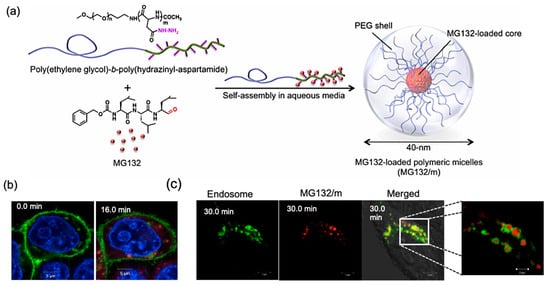 Proteasome inhibitor with MG132-loaded pH-sensitive polymeric micelles. (a) Proteasome inhibitor MG132 was conjugated to the hydrazide moieties of PEG-b-poly(hidrazinyl-aspartamide) copolymer, and this polymer subsequently self-assembled in aqueous media to form polymer micelles with size of around 40 nm. (b) In vitro CLSM images of dissociation of BODIPY TR-labeled MG132/m (red) in HeLa-luc cells. Cell membrane was tagged with GFP (green), and the nucleus with Hoechst (blue). Absence of colocalization of micelles and cell membrane confirms the disintegration of the micelles only in the intracellular space. (c) In vitro CLSM images of the dissociation of BODIPY TR-labeled MG132/m (red) in late-endosomal compartments, which were marked with GFP (green); enlarged section is shown in the flap. Reprinted with permission from [23]. Copyright Elsevier 2014.