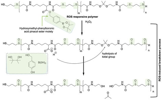 Schematic representation of H2O2-responsive ROS-ARP degradation mechanism. ROS-responsive moieties are highlighted in green. Recreated from [59].