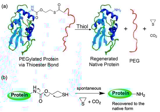 Example of glutathione/reductive environment-sensitive traceless PEG detachment. (a) Schematic representation of thioester-mediated, traceless, reversible PEGylation of protein. (b) Chemistry involved in protein regeneration after PEG detachment via thioester-cleavage-generated thiol group triggers an intramolecular reaction to generate a three-membered thiirane and CO2, rescuing the protein in its native form. Reprinted with permission from [74]. Copyright ACS 2013.