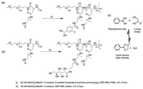 Scheme for installing phenylboronic acid and polyols on to PEG-b-polycations and representation of subsequent boronic ester formation/breakdown. Reaction conditions for introducing (a) 4-carboxy-3-fluorophenylboronic acid (FPBA) and (b) N-gluconamide (GlcAm) as polyol segments on polymers. (c) Representation of equilibrium between, formation, and breakdown of boronic ester. Recreated from [75].