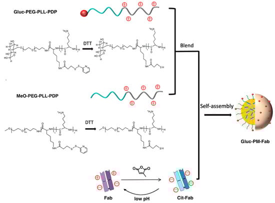 Graphical representation of the design of a dual pH–redox-sensitive, Fab-encapsulated, glucosylated polymeric nanomicelle (Gluc-PM-Fab) development via the assembly of negatively charged Cit-Fab and the positively charged block copolymers. Reprinted with permission from [81]. Copyright ACS 2020.
