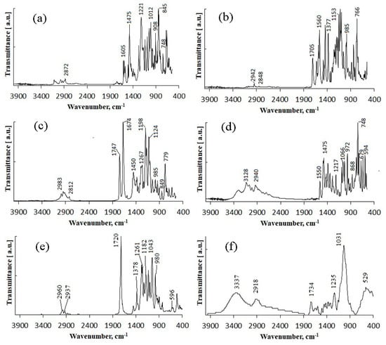 IR spectra of initial matrix materials and fungicides: (a)—difenoconazole; (b)—azoxystrobin; (c)—mefenoxam; (d)—prothioconazole; (e)—P(3HB); (f)—birch wood flour.
