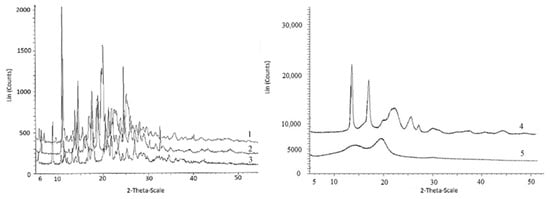 X-ray spectra of initial matrix materials and fungicides: 1—difenoconazole; 2—azoxystrobin; 3—prothioconazole and materials of the matrix 4—P(3HB) and 5—birch wood flour.