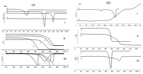 Results of thermal analysis of fungicides (a) and materials of the matrix (polymer and wood flour) (b): I—DSC curves; II—TGA curves; III—weight loss of the samples under heating in differential form: 1—difenoconazole; 2—azoxystrobin; 3—mefenoxam; 4—prothioconazole; 5—P(3HB); 6—birch wood flour.
