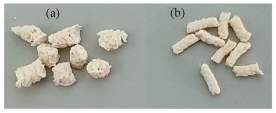 Photographs and SEM images of fungicide-loaded granules are presented in Figure 4 and Figure 5. Differences in the polymer and wood flour properties became noticeable as differences in the surface structure of the granules (Figure 5). SEM images of the granule surfaces show that wood flour used as a component of the blend altered the surface microstructure: the surface was rough, and oblong wood flour particles were visible. Azoxystrobin mixed with P(3HB) and natural fillers was studied previously [62]; the other fungicides embedded in the degradable P(3HB)/birch wood flour blend were studied for the first time in the present work.
