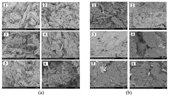 SEM images of the microstructure of fungicide loaded granules before soil application (a) and during degradation in soil (b): 1—P(3HB)/wood flour/difenoconazole; 2—P(3HB)/wood flour/azoxystrobin; 3—P(3HB)/wood flour/mefenoxam; 4—P(3HB)/wood flour/azoxystrobin + mefenoxam; 5—P(3HB)/wood flour/prothioconazole; 6—P(3HB)/wood flour.