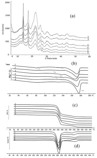X-ray images (a), DSC curves (b), DTA curves (c) and weight loss of the fungicide loaded granules in the differential form (d): 1—P(3HB)/wood flour/difenoconazole; 2—P(3HB)/wood flour/azoxystrobin; 3—P(3HB)/wood flour/mefenoxam; 4—P(3HB)/wood flour/azoxystrobin + mefenoxam; 5—P(3HB)/wood flour/prothioconazole; 6—P(3HB)/wood flour.