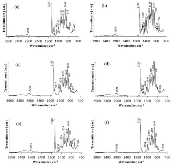 IR spectra of fungicide formulations: (a)—P(3HB)/wood flour/difenoconazole; (b)—P(3HB)/wood flour/azoxystrobin; (c)—P(3HB)/wood flour/mefenoxam; (d)—P(3HB)/wood flour/azoxystrobin + mefenoxam; (e)—P(3HB)/wood flour/prothioconazole; (f)—P(3HB)/wood flour.
