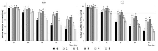 The weight loss of fungicide-loaded granules of two sizes ((a)—3.0; (b)—1.5 mm) incubated in soil: 0—unloaded formulation; 1—P(3HB)/wood flour/difenoconazole; 2—P(3HB)/wood flour/azoxystrobin; 3—P(3HB)/wood flour/prothioconazole; 4—P(3HB)/wood flour/azoxystrobin + mefenoxam; 5—P(3HB)/wood flour/mefenoxam. The letters indicate the significance of differences when comparing groups according to the Mann-Whitney test at the level of p < 0.05; identical letters indicate no significant differences.