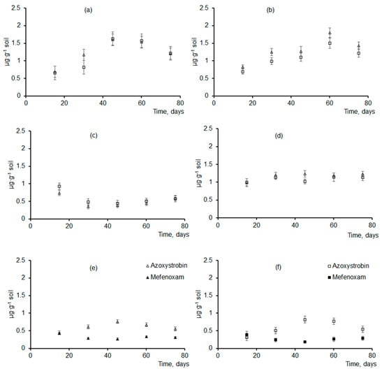 Current soil concentrations of fungicides (µg·g−1) released from experimental granules of different sizes: triangles—smaller granules (1.5 mm diameter); squares—larger granules (3.0 mm diameter). (a)—P(3HB)/wood flour/azoxystrobin, (b)—P(3HB)/wood flour/difenoconazole, (c)—P(3HB)/wood flour/mefenoxam, (d)—P(3HB)/wood flour/prothioconazole, (e)—P(3HB)/wood flour/azoxystrobin + mefenoxam (smaller granules), (f)—P(3HB)/wood flour/azoxystrobin + mefenoxam (larger granules).