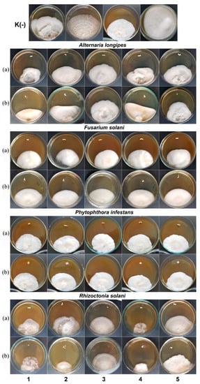 The biological activity of embedded fungicides was tested in vitro, in cultures of phytopathogenic fungi, using experimental granules. In the positive control, free fungicides at the same concentrations were used. The following species of phytopathogenic fungi were tested: Alternaria alternata, Alternaria longipes, Boeremia exigua, Phytophthora infestans, Rhizoctonia solani, Fusarium oxysporum, Fusarium redolens, Fusarium solani, Fusarium equiseti, and Fusarium vanettenii. These pathogens were previously isolated from the samples of the study field soil and tubers of potato cv. Krasnoyarskiy ranniy and identified using conventional culture-based and molecular-genetic methods. The nucleotide sequences of the 28S rRNA gene fragments of the isolated fungi are available in GenBank (No. MZ424190-MZ424199) [81].