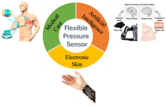 Flexible sensor is an important part of wearable devices and electronic skin [14,15]. It can effectively detect various stimuli related to specific environment or biological species, having a very bright development prospect. Among them, the research on flexible pressure sensor is the most popular, because pressure is one of the most common forms of interaction between humans and the world. Therefore, various wearable devices based on flexible pressure sensors are developing rapidly and have a wide range of applications in medical care [16,17], artificial intelligence [18], electronic skin [19,20,21], and other fields, as shown in Figure 1.