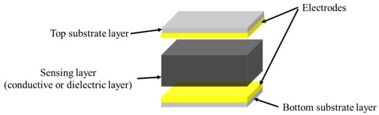 As shown in Figure 2, the structure of flexible pressure sensor is mainly composed of a top and bottom substrate layer, middle sensing layer (piezoresistive, capacitive, piezoelectric and triboelectric), and electrodes. After long-term research by scientists, a lot of excellent materials have been used to assemble flexible pressure sensors, such as high elastic polymer materials such as polydimethylsiloxane (PDMS) [22,23,24], polyimide (PI) [25], Ecoflex [26], and polyethylene terephthalate (PET) [27] as flexible substrate/dielectric layer, and materials with good conductivity such as graphene [28], carbon nanotubes (CNT) [29,30], MXenes [31,32], and silver nanowires (AgNWs) [33] as sensing materials and electrodes, so as to give the sensor excellent sensitivity and wide sensing range. However, with the development of society, people put forward higher requirements for the performance of flexible pressure sensor.