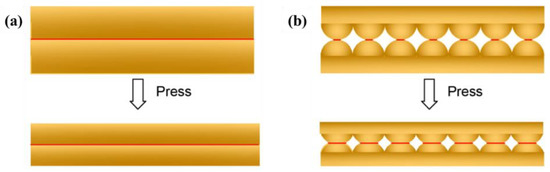 The introduction of microstructure can cause greater deformation of the internal contact area of the sensor, resulting in more obvious changes in electrical quantities. Its internal mechanism is that the contact area will become larger, as shown in Figure 4, resulting in effects such as the increase of conductive path (Figure 4a) [39,40] and the accumulation of tunnel effect (Figure 4b) [41], so as to improve the sensitivity, sensing range, and other characteristics of the sensor.