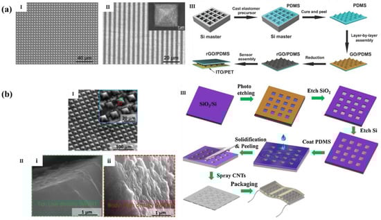 Additionally, as shown in Figure 9b, Zou et al. [80] used the same method to produce wave microstructures on the surface of PDMS. Then, transverse cracks were made on the wave microstructure by transverse tension, which further improved the force sensitivity of the sensor. Then, the ionic gel was spin coated to the wave microstructures as the dielectric layer, and CPI/AgNws was used as the electrode to assemble a flexible sensor with CPI/AgNWs/Ionic Dielectric Layer/AgNWs/CPI sandwich structure. The sensor has a wide sensing range (300 kPa), high sensitivity (92 kPa−1, <400 Pa), and a minimum detection limit of 1 Pa.