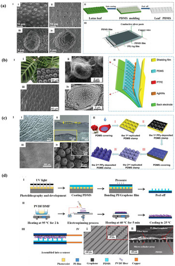 Wang et al. [47] re-engraved the lotus leaf surface microstructure on PDMS, and then manufactured a sensitive sensor integrating strain and pressure sensing by sandwiching polypyrrole (PPy)/Ag hybrid film between two micro pattern PDMS substrates, as shown in Figure 7a. The sensitivity of the flexible sensor can reach about 0.58 kPa−1 in the range of 200–300 Pa. Yao et al. [48] applied the Calathea Zebrine blade to the manufacture of triboelectric sensor and used the microstructure of the blade as a template to construct a friction layer with interlocking structure, as shown in Figure 7b. The results show that the sensitivity (127.22 mV kPa−1) of the flexible pressure sensor with bionic microstructure is 14 times higher than that of the sensor with flat friction layer, with high cycle stability (5000 cycles). In addition, as shown in Figure 7c, Yu et al. [49] re-etched PDMS substrate with rose microstructure by secondary template method, and deposited PPy active layer on the surface to form the sensor. The hillock structure on the surface of PDMS combined with the wrinkle pattern of PPy film gives the sensor ultra-high sensitivity (70 kPa−1, <0.5 kPa), ultra-low detection limit (0.88 Pa), wide pressure detection range (32 kPa), and rapid response time (30 ms). Moreover, due to the photoelectric characteristics of PPy, the sensitivity of the sensor is increased to 120 kPa−1 (<0.5 kPa), and the lower detection limit is 0.41 Pa under illumination.