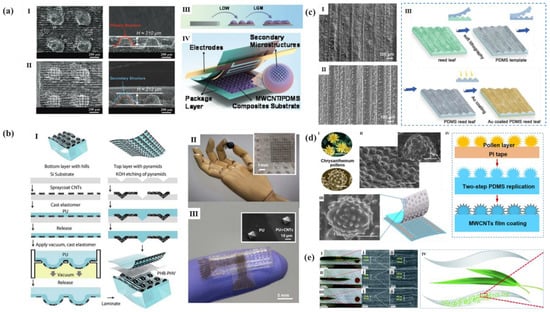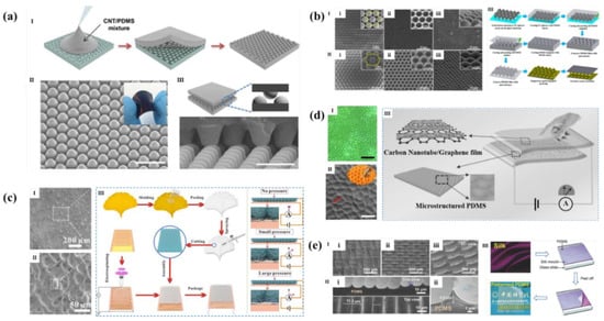 In addition, researchers also use artificial templates to get micro fluctuation structures, such as silk with a rough surface. As shown in Figure 8e, Wang et al. [67] used silk as a template and coated PDMS on the silk template to obtain a micro convex structure. After attaching single wall nanotubes (SWNTs) to its surface, a piezoresistive pressure sensor can be made, which had a sensitivity of 1.80 kPa−1 (<300 Pa), a low detection limit of 0.6 Pa, and a stability of more than 67,500 cycles.