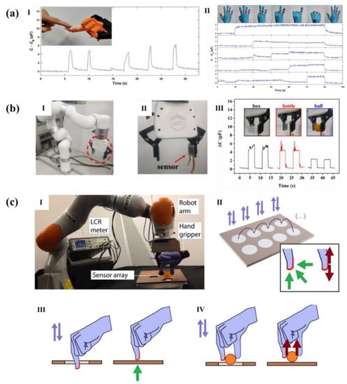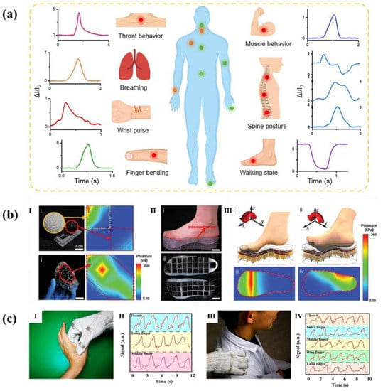 Inspired by human skin, Sun et al. [118] developed a substrate combining folds with micro columns, and the sensor maintained good linearity (maximum 270 kPa) in a wide sensing range. Therefore, the sensor can detect physiological signals from the human body that span the pressure range of several orders of magnitude. Owing to sensor’s wide sensing range, it can be used to detect foot pressure distribution which is above a few hundred kilopascals. Scientists integrated a flexible sensor with 25 pixels into a 3-D printed insole. As shown in the mapped intensity profile (Figure 14b), the flexible sensor could accurately detect the foot pressure distribution depending on the foot posture. Ding et al. [119] developed a fabric-based pressure sensor assembled with cross-arranged pre-stretchable conductive yarn (PCY) weft and warp. The researchers directly weave the yarn into the gloves to form a pressure sensor. When a hand wore the smart glove under tension or pressure, different sensing signals were obtained. The smart gloves were used to massage the acupuncture points at the hand and shoulder. As presented in Figure 14c, the current signals of each finger were different due to tiny distinctions of massage intensity from each finger. According to the real-time signal change, the massage pressure can be monitored to avoid a burden for the skin and acupunctured point caused by over pressing. In addition, since the yarn can be woven into different sizes and patterns, the fabric assembled with the PCY sensor was suitable for a large area and real-time monitoring of coupling forces of pressure and tension in fine human motion and smart robots.