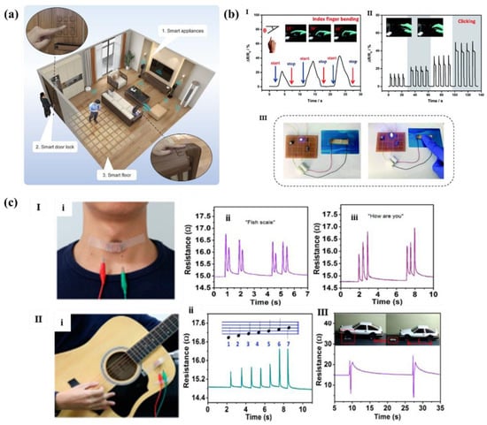 Flexible electronic/wearable technology is one of the research hotspots [1,2,3,4,5,6]. According to the analysis in the report of IDTechEx, a well-known research company in the UK, the total market size of wearable products in the world is close to US $80 billion now, which has tripled in 2014, and it is predicted to reach US $138 billion in 2025 [7]. In addition, the development of electronic skin is driven by the growing interest in artificial intelligence [8], man-machine interface [9], and prosthetic skin [10]. What is more, wearable devices have great potential in health monitoring and nursing applications [11,12,13].