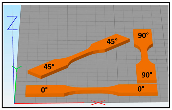 As shown in Figure 2, three orientations were used during parts’ placement on the XY plane in order to study the impact of hatch orientation on mechanical properties. Hatching was conducted by alternating one layer of laser scans at 0° (e.g., parallel to the X-axis) with the following layer at 90° (e.g., perpendicular to the X-axis). As this hatching strategy is applied by the software independently of the part’s orientation on the XY plane, it results in the 0° and 90° orientation parts exhibiting an identical hatching strategy, albeit with a one-layer shift. Due to their hatching similarity, parts with the 0° orientation were placed in the center of the SLS build platform, while parts with a 45° and 90° orientation were positioned all around toward the sides. Three printing runs, with laser power ranging from 45 W to 57 W, were conducted with the purpose of studying the effect of the laser power on the mechanical properties of the 3D-printed parts. The laser power used in this work will be defined as percentage of the maximum laser power of the machine, which is 60 W (LP: 75% is equal to 45 W, LP: 85% is equal to 51 W, and LP: 95% is equal to 57 W).