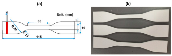 A tensile test was used to establish tensile properties of 3D-printed SLS-PA12 specimens, including tensile strength, Young’s modulus, and deformation at break. The specimens used were designed according to the ASTM D638-14 “Standard Test Method for tensile properties of plastics”. Three runs were conducted in series to study different laser power and different build orientation as well. Each series comprised six specimens of the D638 type-5 geometry as shown in Figure 3. Testing was carried out on a Criterion C45.105 electromechanical universal testing machine (MTS, USA) equipped with a 10 kN load cell and self-tightening jaws. A crosshead displacement speed of 5 mm min−1 was used.