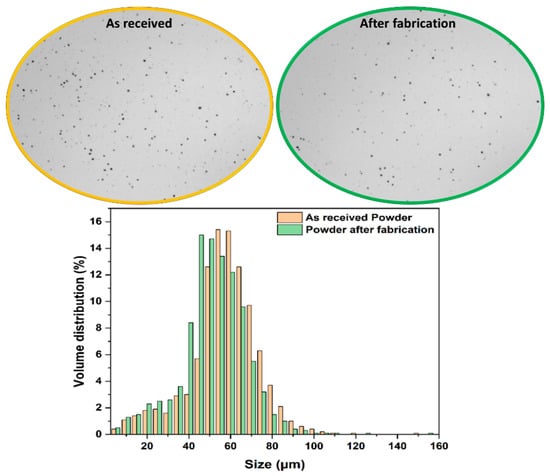 Volume distribution as function of the size for the “As-received powder” and “Powder after fabrication”.