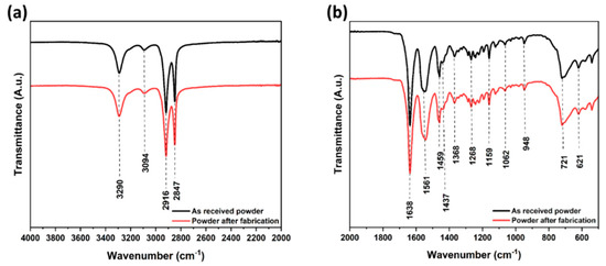 Fourier-transform infrared (FTIR) spectra of PA12 powders: As-received powder; Powder after fabrication. (a)-wavenumber from 2000 to 4000 cm−1; (b)-wavenumber from 550 to 2000 cm−1.