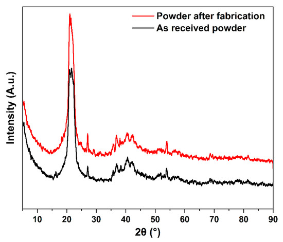 X-ray diffraction patterns of the as-received powder and powder after fabrication in range 4.5–90°.