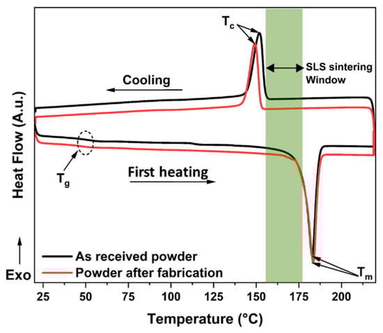 The DSC technique was applied to study the glass transition temperature, melting temperature range, and the degree of crystallinity of the PA12 material. Figure 8 shows the DSC curves for both the as-received powder and the powder after fabrication. Both curves follow almost the same shape, showing three specific thermal transitions: The first transition at around 50 °C is associated with the glass transition (Tg) phase where the polymer changes to a highly elastic state [54]. The second thermal transition, associated with the melting temperature (Tm), corresponds to the endothermic peak detected at 182 °C. During cooling, a third transition, observed at 151 °C, is attributed to the crystallization (Tc) of PA12, where a rearrangement of the molecular chains takes place to create crystalline lamellae inside the continuous amorphous structure. These results show that both types of PA12 powder are in a semi-crystalline state after the cooling process. As shown in Figure 8, there is a large distance between the melting and crystallization peaks, which indicates a tendency of PA12 to warp or curl during the laser-sintering process [42]. This meta-stable thermodynamic region of undercooled polymer is usually called the “SLS sintering window”. It is important to select a sintering temperature in this temperature window range to obtain the best printing results of the material without degrading it. For both powders, the sintering temperature window of PA12 is in the range of [155 °C, 176 °C]. The crystallization temperature (Tc) must also be avoided as long as possible during processing.