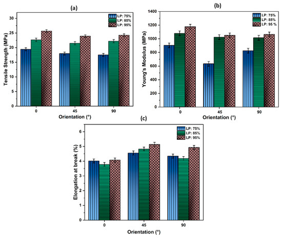 Tensile properties as a function of XY plane orientation and laser power: (a) Tensile Strength; (b) Young’s Modulus; (c) Elongation at break.