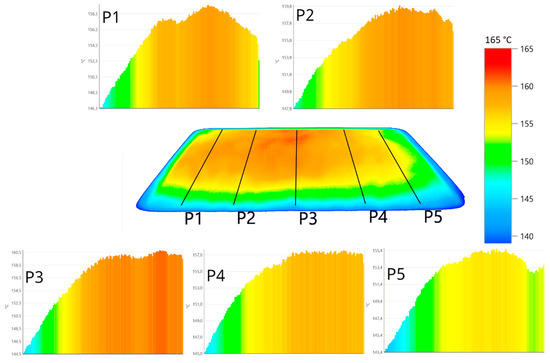 Thermal imagery of the SLS powder layer during preheating. P1 to P5 are front-to-back temperature profile taken from left to right of the platen (note that the Y-axis does not have the same numeral scale).